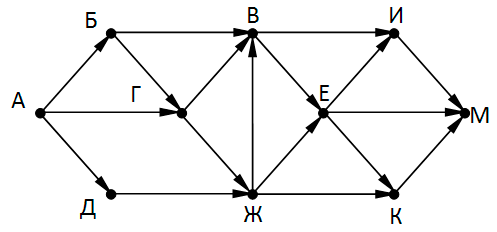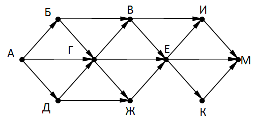 На рисунке - схема дорог, связывающих города А, Б, В, Г, Д, Е, Ж, И, К, М. По каждой дороге можно двигаться только в одном направлении, указанном стрелкой.