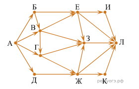 На рисунке — схема дорог, связывающих города А, Б, В, Г, Д, Е, Ж, З, И, К и Л. По каждой дороге можно двигаться только в одном направлении, указанном стрелкой. Сколько существует различных путей из города А в город Л?