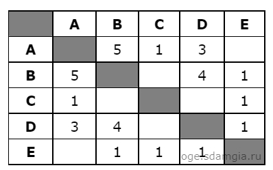 Между населёнными пунктами A, B, C, D, E построены дороги, протяжённость которых (в километрах) приведена в таблице.