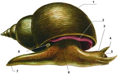 Рассмотрите рисунок, подпишите названия частей тела изображенного моллюска
