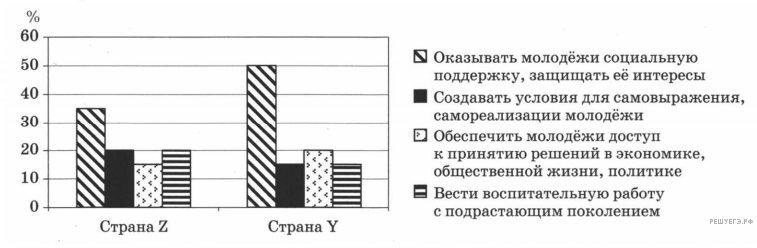- Доля тех, кто считает, что молодёжная политика должна обеспечить молодёжи доступ к принятию решений в экономике, общественной жизни, политике, в стране Z меньше, чем в стране Y.