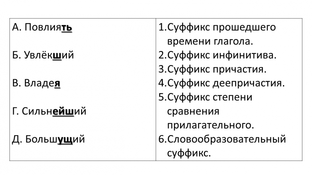 12. Установите соответствие между выделенными суффиксами и их характеристиками: