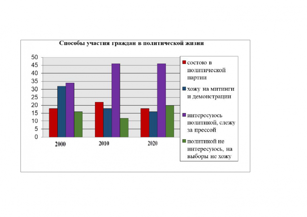 В преддверии парламентских выборов в стране Z в период с 2000 по 2020 г. социологическими службами проводился опрос. Респондентам предстояло ответить на вопрос: «Каким образом Вы участвуете в политической жизни общества?» Полученные результаты опроса представлены в виде диаграммы (в % от числа опрошенных). Какие три вывода следует сделать на основании результатов опроса?