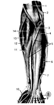 - Латеральную и медиальную головки трёхглавой мышцы