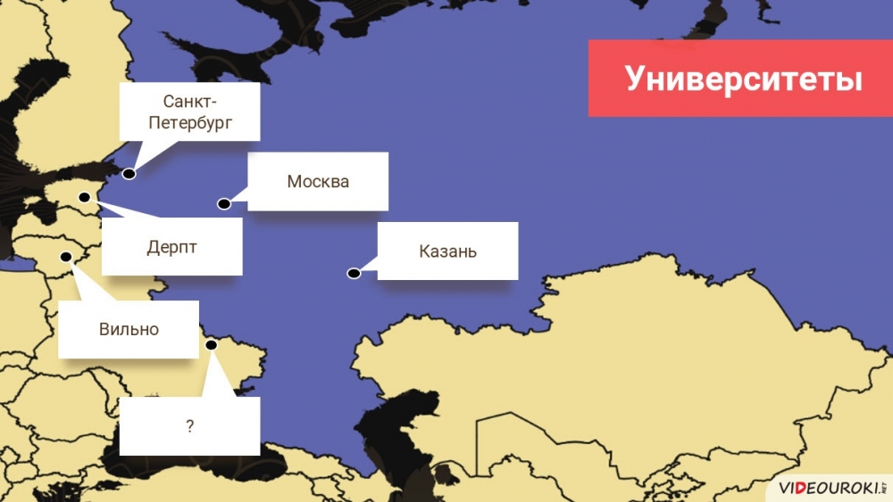 На карте отмечены города, в которых находились университеты. Напишите название города, обозначенного знаком вопроса.