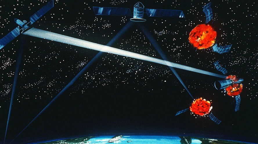 Вспомните, как называлась программа разработки противоракетной обороны США, концепция которой отражена на данном рисунке. В качестве ответа напишите аббревиатуру её названия.