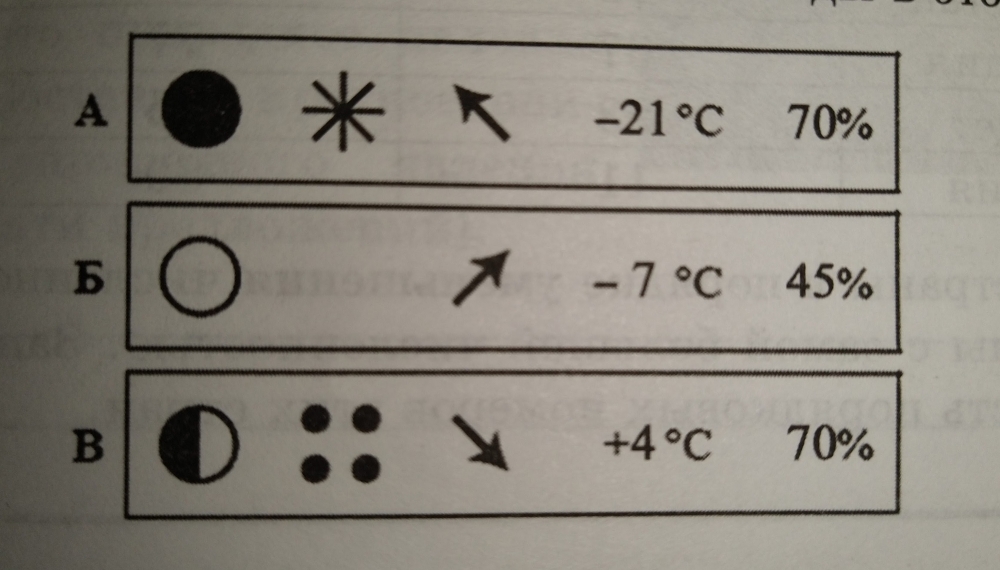 На фото знаками изображены элементы погоды. Под каким номером изображены знаки обозначающие разные виды осадков? Назовите осадки, изображённые знаками. Ответ записывать без запятых через пробел