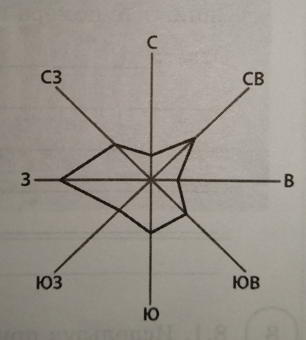 На метеорологической станции города N были проведены наблюдения за направлением ветра.По результатам наблюдений за месяц метеорологи построрили розу ветров. Рассмотрите розу ветров и ответьте