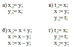 После выполнения каких из указанных ниже последовательностей команд значения величин х и у поменяются, т.е. х примет значение у, а у – значение х? В ответе указать букву правильного варианта.