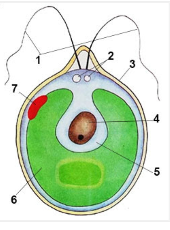 Рассмотрите рисунок. Укажите названия частей клетки водоросли: