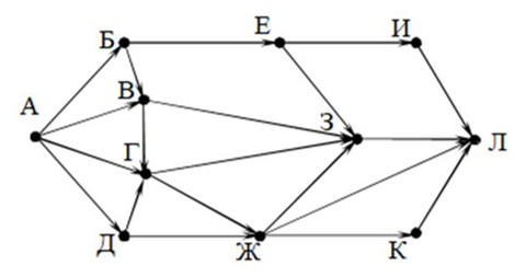 На рисунке – схема дорог, связывающих города А, Б, В, Г, Д, Е, Ж, З, И, К и Л. По каждой дороге можно двигаться только в одном направлении, указанном стрелкой. Сколько существует различных путей из города А в город Л, проходящих через город Ж?
