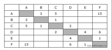 Между населёнными пунктами A, B, C, D, E, F построены дороги, протяжённость которых в (километрах) приведена в таблице.