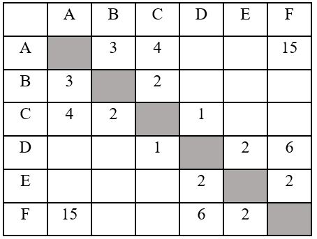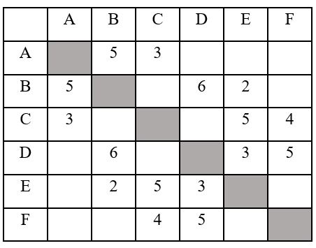Между населёнными пунктами A, B, C, D, E, F построены дороги, протяжённость которых (в километрах) приведена в таблице.