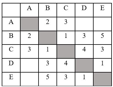 Между населенными пунктами A, B, C, D, E построены дороги, протяженность которых (в км) приведена в таблице.