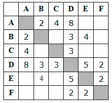Между населёнными пунктами A, B, C, D, E, F построены дороги, протяжённость которых приведена в таблице. Отсутствие числа в таблице означает, что прямой дороги между пунктами нет. Определите длину кратчайшего пути между пунктами A и E, проходящего через пункт D. Передвигаться можно только по указанным дорогам.