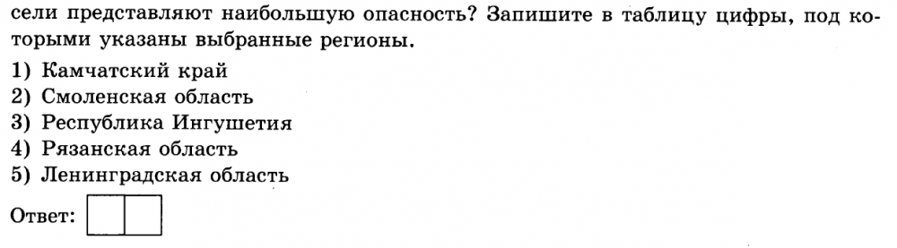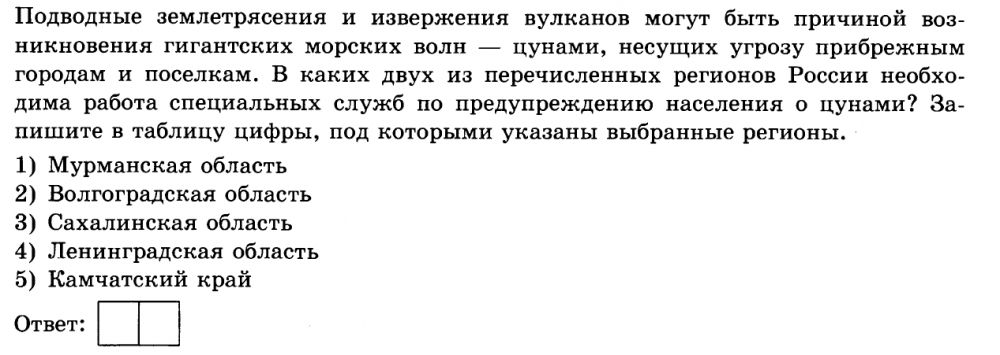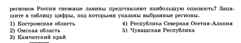 МЧС России ежегодно готовит прогнозы сейсмической активности в сейсмоопасных районах страны. Для жителей каких двух регионов нужны такие прогнозы? Запишите в таблицу цифры, под которыми указаны выбранные регионы.
