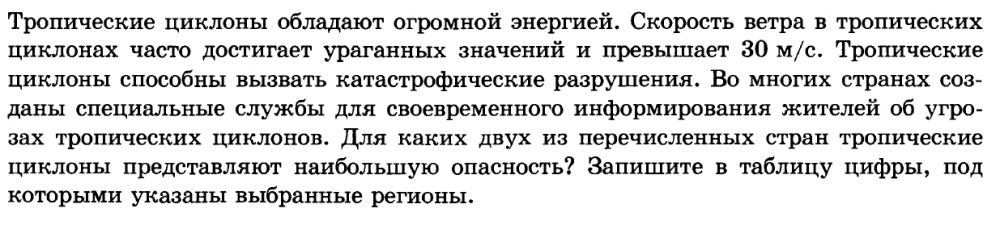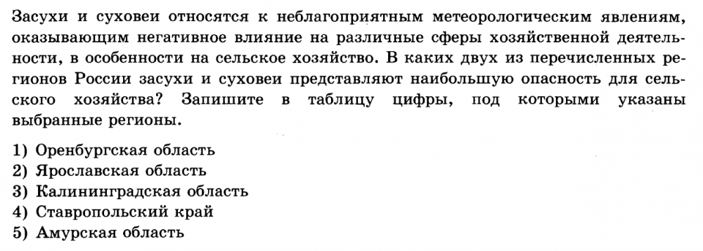 «Сжигающие без огня» — так называют суховеи. Суховей — ветер с высокой температурой и низкой относительной влажностью воздуха. Там, где они пронеслись, засыхают и погибают растения, даже при достаточном запасе влаги в почве, так как корневая система не успевает подавать в наземную часть достаточное количество воды». В каких двух из перечисленных регионов России суховеи представляют наибольшую опасность? Запишите в таблицу цифры, под которыми указаны выбранные регионы.
