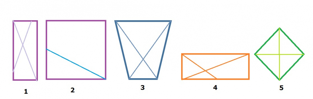 Среди геометрических фигур на рисунке найдите прямоугольники, в которых проведена хотя бы одна диагональ.