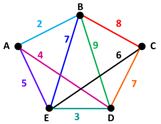 Почтальону необходимо посетить 5 населенных пунктов. На схеме они обозначены латинскими буквами, числа указывают расстояние между пунктами. Найдите длину наиболее короткого пути; путь может начинаться с любого населённого пункта.