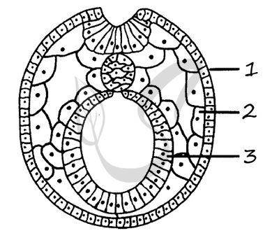 Рассмотрите рисунок и назовите зародышевый листок позвоночного животного, обозначенный цифрой 2. Какие типы тканей и органы формируются из него?