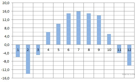 На диаграмме показана среднемесячная температура в Нижнем Новгороде (Горьком) за каждый месяц 1994 года. По горизонтали указываются месяцы, по вертикали — температура в градусах Цельсия. Определите по диаграмме наименьшую среднемесячную температуру в 1994 году. Ответ дайте в градусах Цельсия.