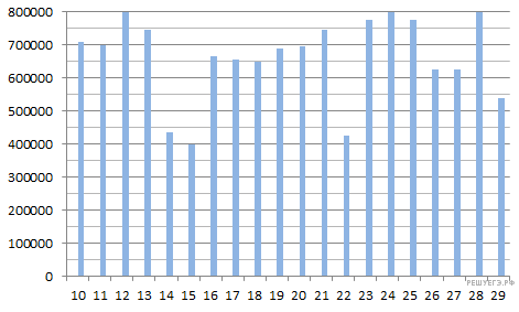 На диаграмме показано количество посетителей сайта РИА Новости во все дни с 10 по 29 ноября 2009 года. По горизонтали указываются дни месяца, по вертикали — количество посетителей сайта за данный день. Определите по диаграмме, какого числа количество посетителей сайта РИА Новости было наименьшим за указанный период.