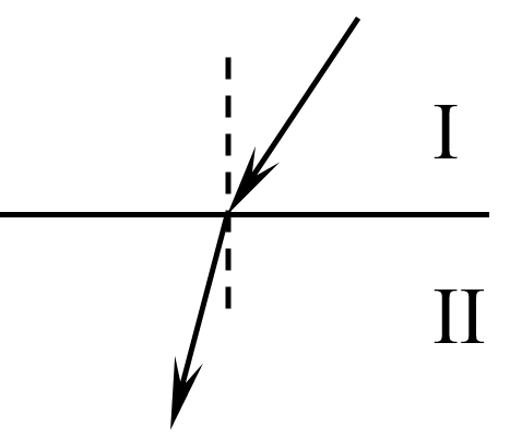 На рисунке показаны падающий и преломлённый лучи света. В какой среде – I или II скорость света больше?