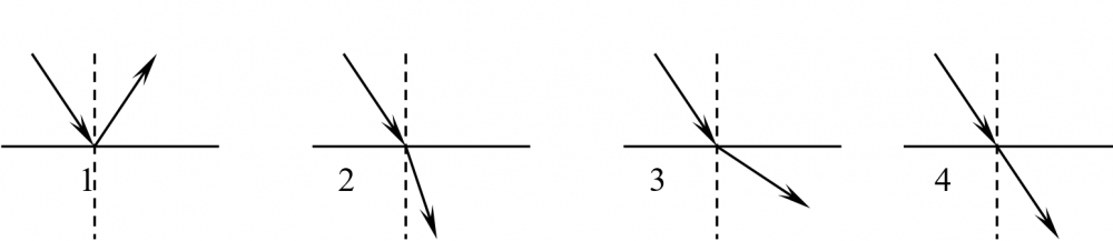 На рисунках изображены падающий и отраженный световые лучи. На каком из них отраженный луч построен правильно?