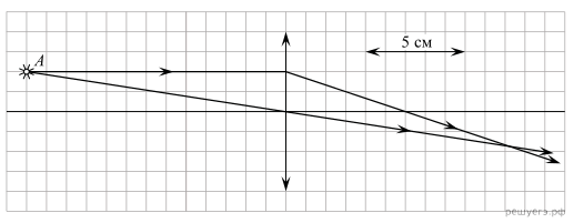 На рисунке показан ход лучей от точечного источника света А через тонкую линзу. Какова оптическая сила линзы? (Ответ дать в диоптриях, округлив до целых)
