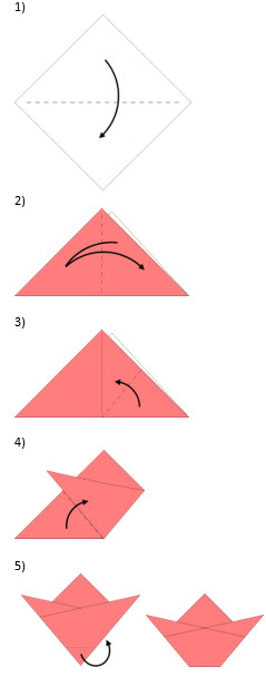 - Берём квадратный лист бумаги красного цвета и складываем его пополам по диагонали.