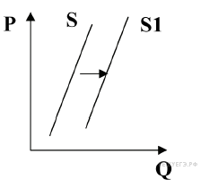 На графике изображено изменение предложения саженцев плодово-ягодных растений на потребительском рынке: кривая предложения переместилась из положения S в положение S1 (на графике Р — цена товара, Q — количество товара). Это перемещение может быть связано прежде всего с (со)