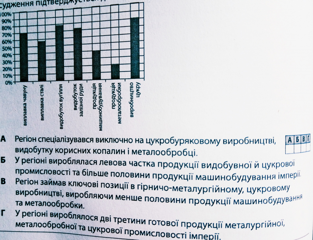 На діаграмі зображено обсяги виробництва певної продукції на Наддніпрянській Україні в обсягах загальнороійського виробництва (у %) на початку ХХ ст. Яке судження підтверджується даними діаграми?