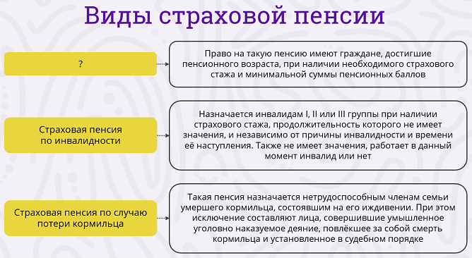- Назначается инвалидам I, II или III группы при наличии страхового стажа, продолжительность которого не имеет значения, и независимо от причины инвалидности и времени её наступления.