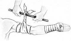 - Палку/дощечку фиксируют двойным узлом