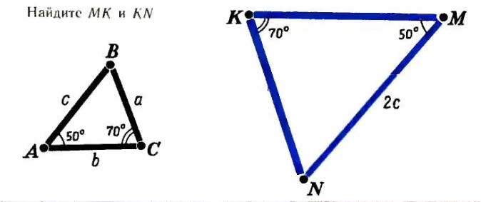 В треугольниках АВС и KMN угол А равен углу N, угол В равен углу М. Назовите подобные треугольники (вершины должны быть перечислены в правильном порядке).