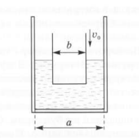 В воду, налитую в сосуд квадратного сечения с вертикальными стенками (длина внутренней стороны квадрата а = 10 см, опускают с постоянной относительно сосуда скоростью v = 8 мм/с стакан квадратного сечения со стороной b = 6 см (см. рисунок). С какой скоростью u уровень воды в сосуде удаляется от дна стакана?