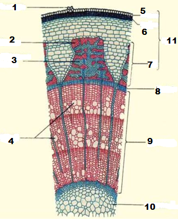 Рост стебля в толщину происходит за счет деления клеток: