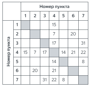 На рисунке изображена схема дорог N-ского района. В таблице числом обозначена длина дороги из одного населённого пункта в другой. Отсутствие числа означает, что такой дороги нет.