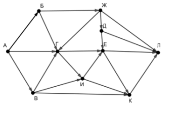 На рисунке — схема дорог, связывающих города А, Б, В, Г, Д, Е, Ж, И, К, Л. По каждой дороге можно двигаться только в одном направлении, указанном стрелкой. Сколько существует различных путей из пункта А в пункт Л, проходящих через пункт Е?