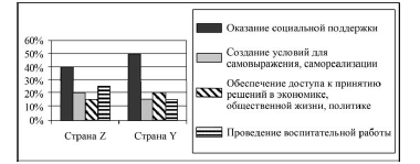 - Доля тех, кто считает наиболее важным оказание социальной поддержки, в стране Z больше, чем в стране Y.