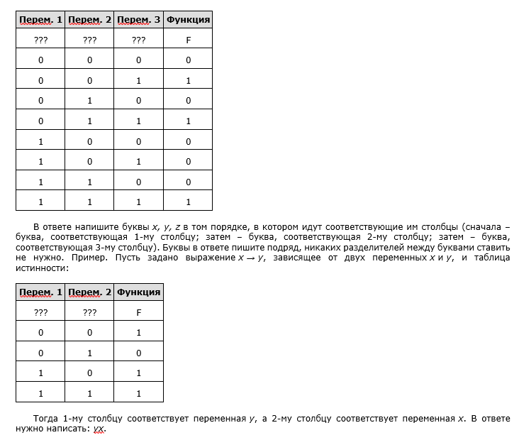 Логическая функция F задаётся выражением (¬z)∧x ∨ x∧y. Определите, какому столбцу таблицы истинности функции F соответствует каждая из переменных x, y, z.