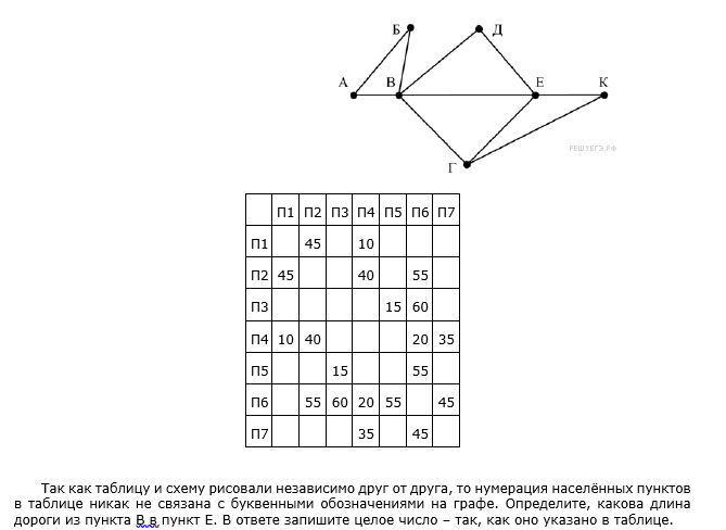 На рисунке справа схема дорог Н-ского района изображена в виде графа, в таблице содержатся сведения о длинах этих дорог (в километрах).