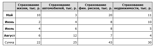 В электронной таблице Excel отражены данные о деятельности страховой компании за 4 месяца. Страховая компания осуществляет страхование жизни, недвижимости, автомобилей и финансовых рисков своих клиентов. Суммы полученных по каждому виду деятельности за эти месяцы страховых взносов (в тысячах рублей) также вычислены в таблице.