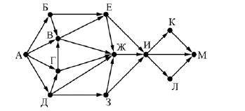 На рисунке представлена схема дорог, связывающих города А, Б, В, Г, Д, Е, Ж, З, И, К, Л, М. По каждой дороге можно двигаться только в одном направлении, указанном стрелкой.