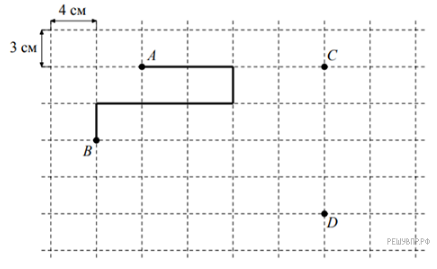 Лист бумаги расчерчен на прямоугольники со сторонами 4 см и 3 см. От точки А к точке В проведена ломаная по сторонам прямоугольников. Найдите длину этой ломаной. Ответ дайте в сантиметрах.