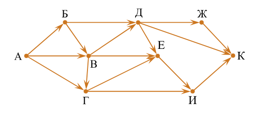 На рисунке — схема дорог, связывающих города А, Б, В, Г, Д, Е, Ж, И, К. По каждой дороге можно двигаться только в одном направлении, указанном стрелкой.