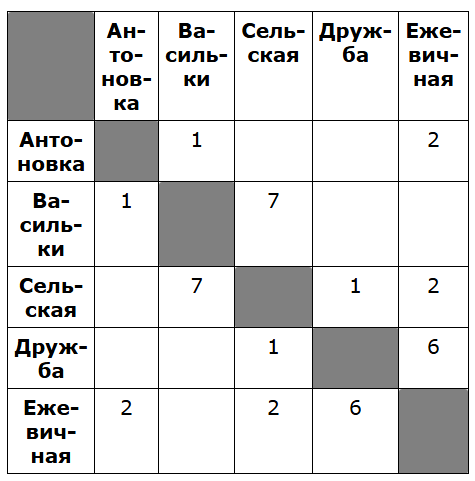 Учительница Марья Петровна живет на станции Васильки, а работает на станции Дружба. Чтобы успеть с утра на уроки, она должна ехать по самой короткой дороге. Проанализируйте таблицу и укажите длину кратчайшего пути от станции Васильки до станции Дружба.