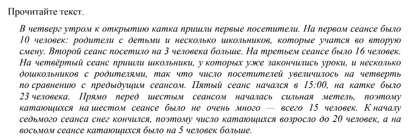 Выберите вариант, в котором верно перечислено количество посетителей катка на каждом сеансе.
