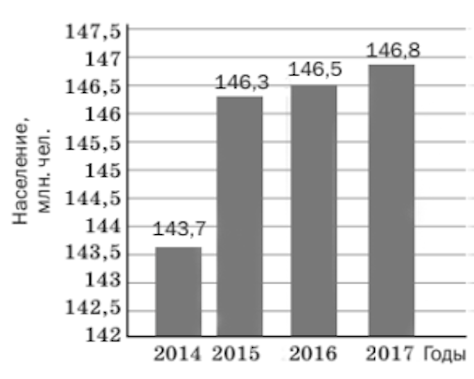 На диаграмме представлены данные о численности населения России с 2014 г. по 2017 г.