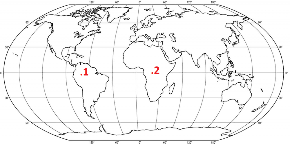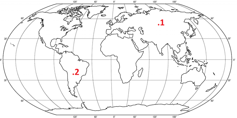 Поставьте точки на контурной карте мира Атласа по приведённым ниже координатам. Обозначьте эти точки соответственно цифрами 1 и 2.